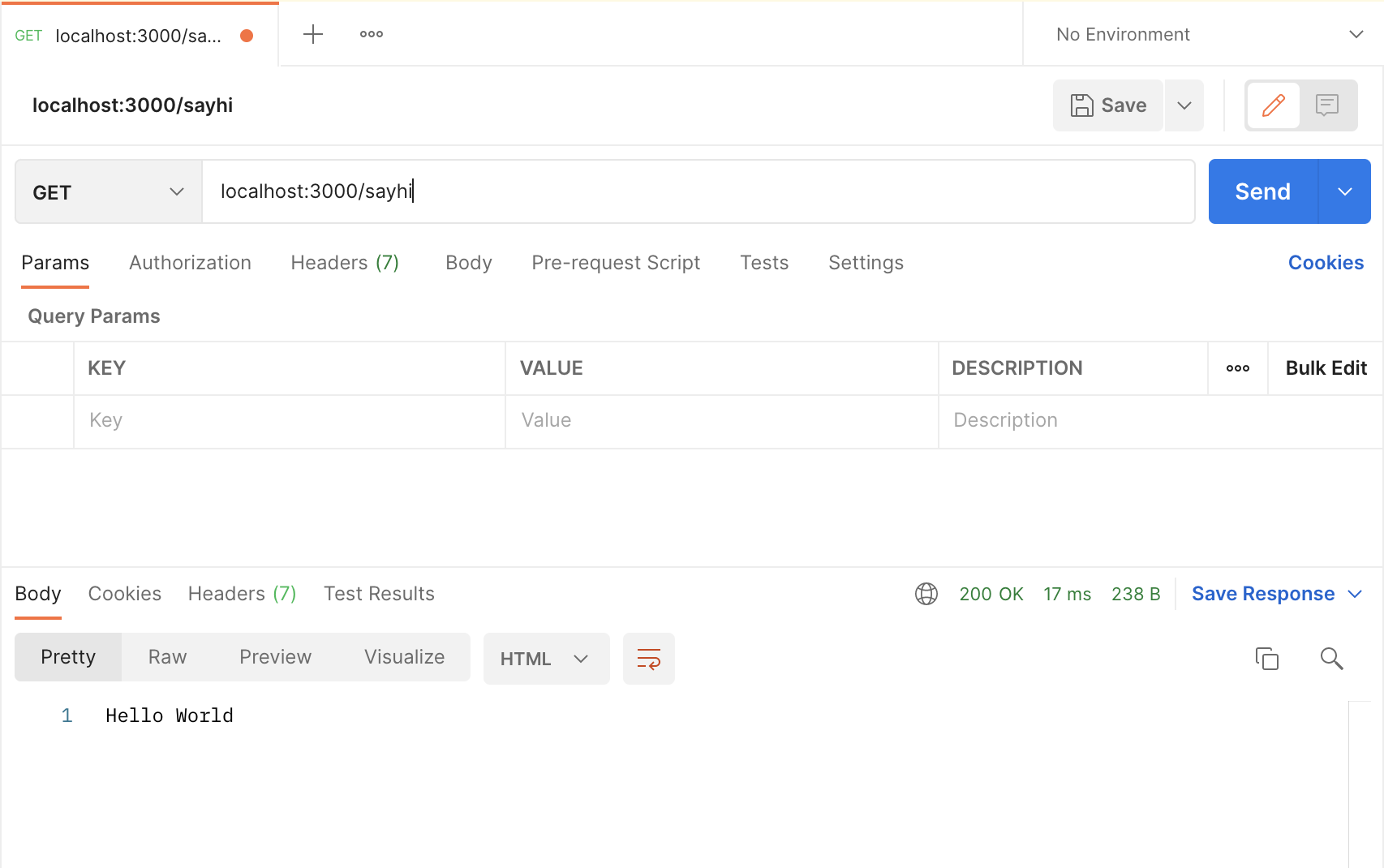Now we can use the function send to return a response. Let's return "Hello World".